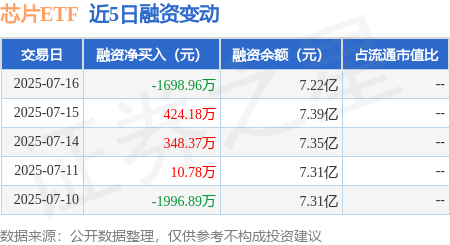 本站消息,7月16日,芯片ETF(159995)融资买入8742.05万元,融资偿还1.04亿元,融资净卖出1698.96万元,融资余额7.22亿元,近20个交易日中有11个交易日出现融资净买入。